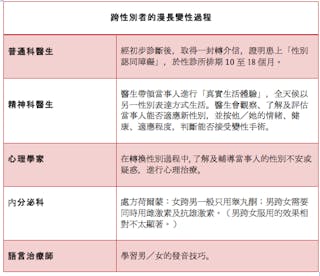 然而,衝破了自己那關,爭取到家人、朋友或伴侶支持,是否等於一帆風順?原來不然。在抵達最後「變性」一關前,跨性別人士仍要過五關斬六將:先向普通科爭取到一封轉介信後,便要排期精神科、心理科、內分泌科、語言治療科、婦科等。把這些專科逐一看完了,已是2﹣5年時間,長度因人而異。